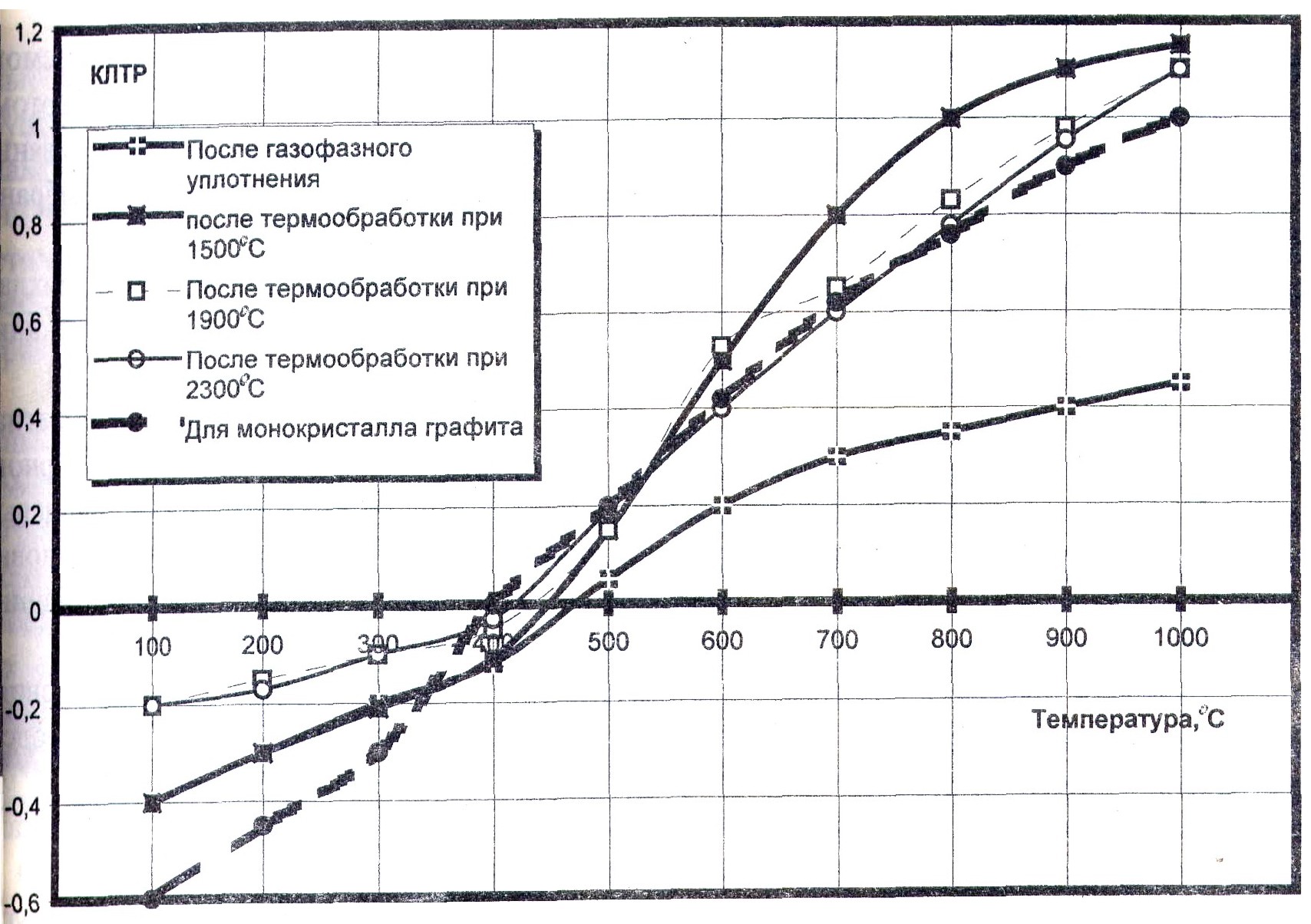 - Низкий температурный коэффициент линейного расширения (ТКЛР). ТКЛР промышленных графитов в интервале температур 20-1000 ?С находится в пределах 5-8 ?10-6 К-1. Для графитов ГСП характерен более низкий ТКЛР - 3-4 ?10-6 К-1. Для углерод-углеродных материалов ТКЛР, обычно, находится в пределах 1-4 ?10-6 К-1. На ТКЛР влияют свойства наполнителя, структура армирования, температура термообработки материала. Влияние температуры обработки на ТКЛР однонаправленных углерод-углеродных композиционных материалов представлено на рисунке.